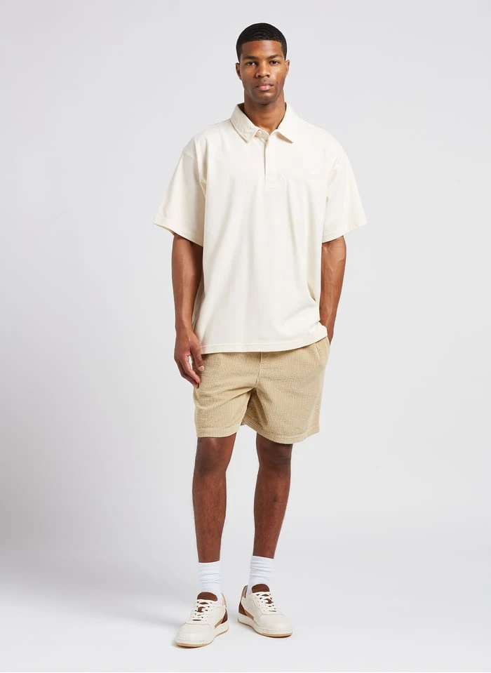 This model is shown wearing Cotton corduroy shorts by AMERICAN VINTAGE, Leather low-top sneakers by FAGUO