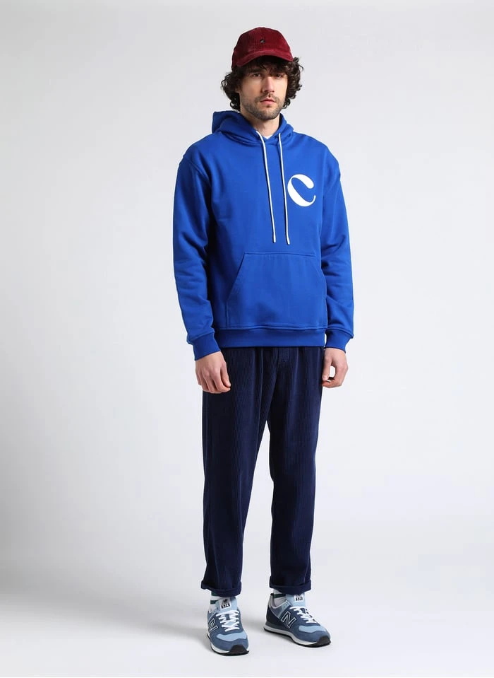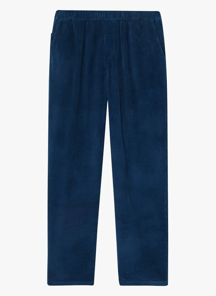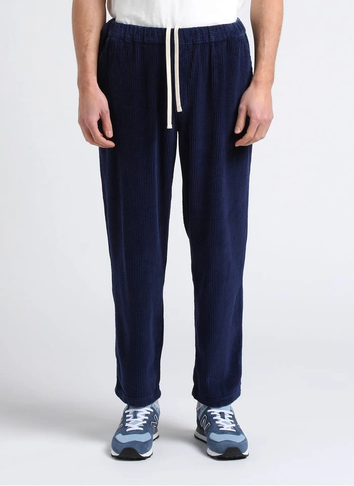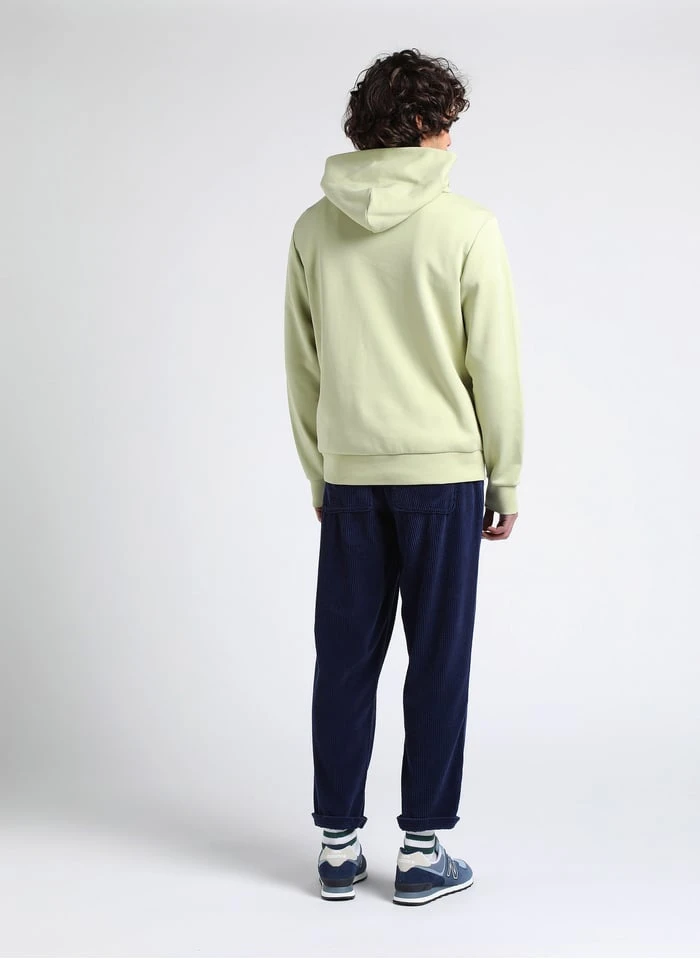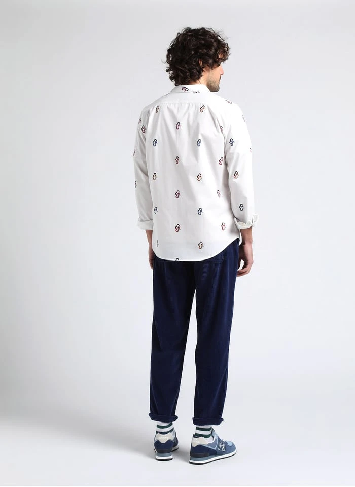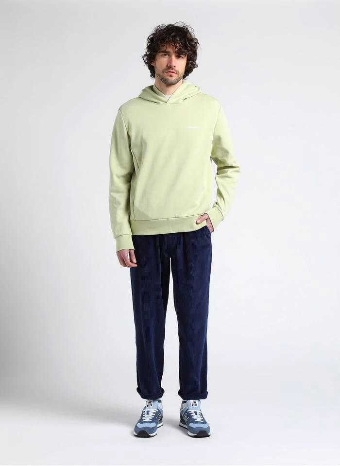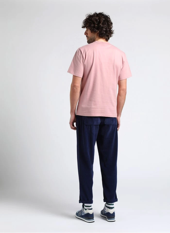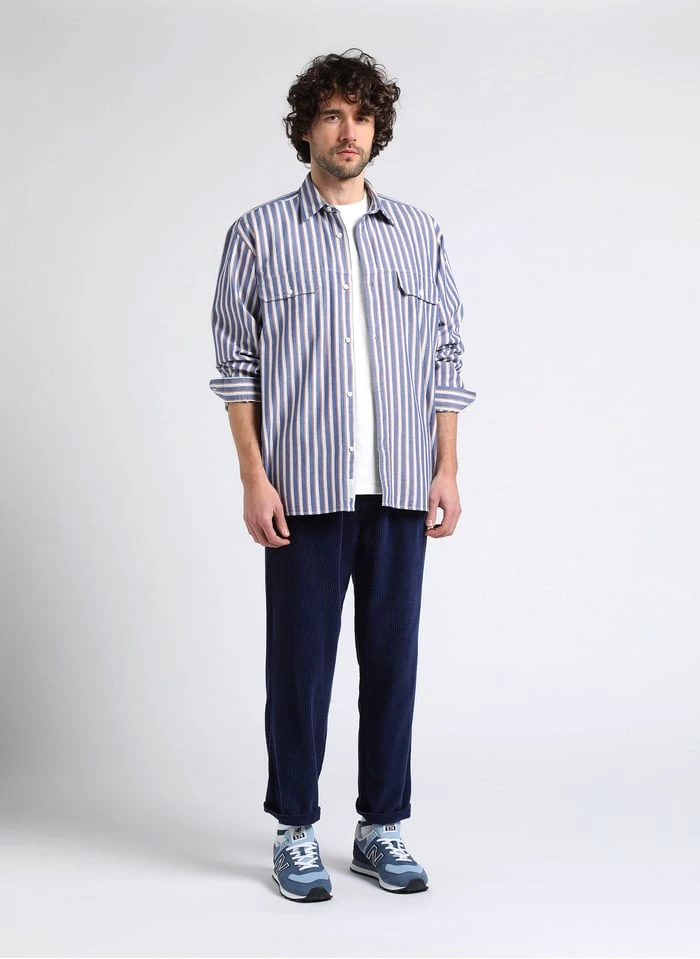 This model is shown wearing Regular-fit long-sleeved cotton T-shirt with round neck by AMERICAN VINTAGE, Lace-up mixed-media sneakers by NEW BALANCE