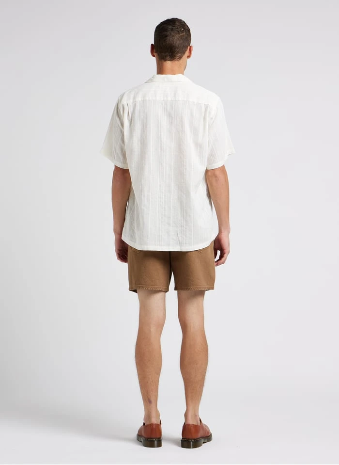 This model is shown wearing Slim-fit organic cotton shorts by SELECTED, Mixed leather Derby shoes by DR. MARTENS