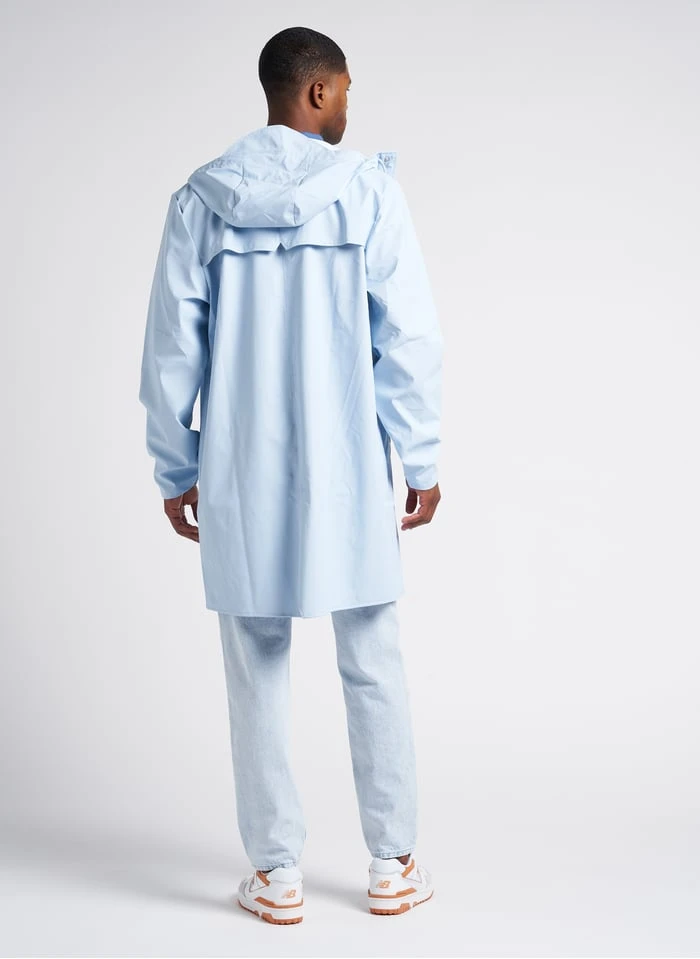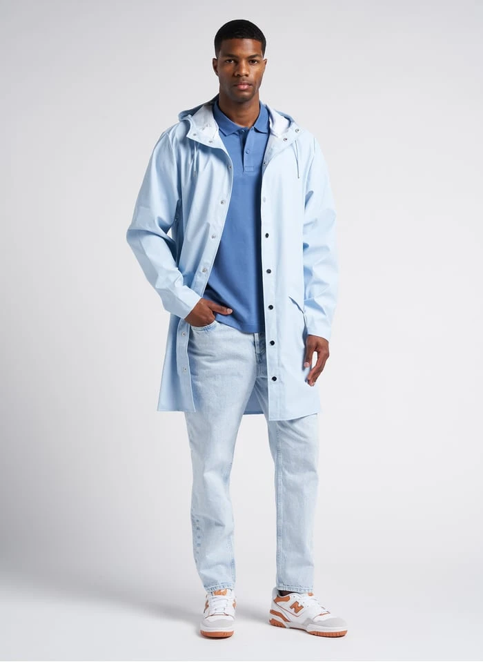 This model is shown wearing Straight-leg faded cotton denim jeans by AMERICAN VINTAGE, Lace-up low-top sneakers by NEW BALANCE, Hooded raincoat by RAINS