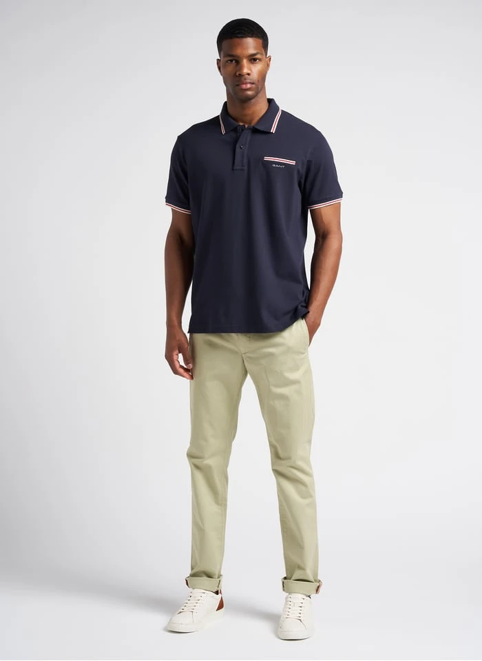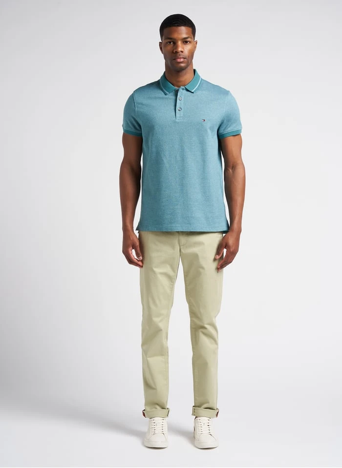 This model is shown wearing Slim-fit organic cotton polo shirt by TOMMY HILFIGER, Leather low-top sneakers by FAGUO