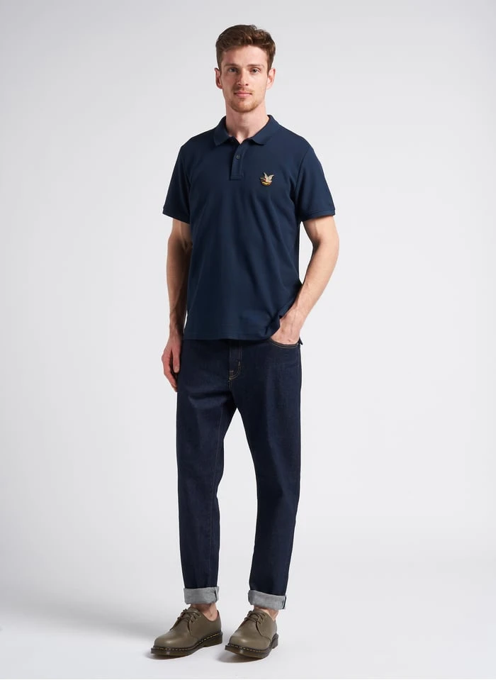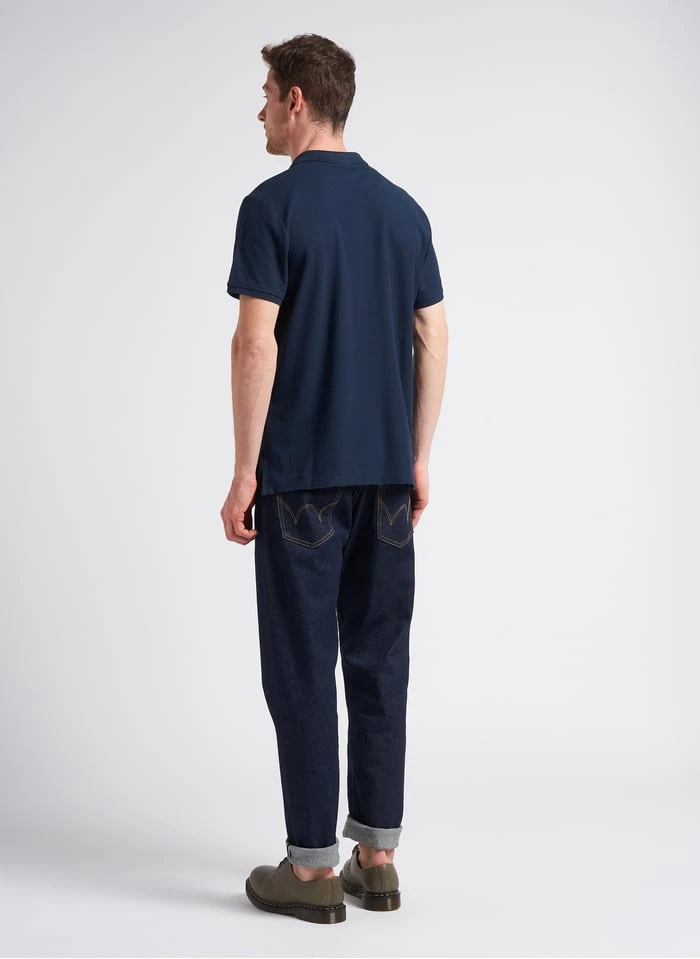 This model is shown wearing Cotton-blend straight-leg jeans by EDWIN, Mixed leather Derby shoes by DR. MARTENS