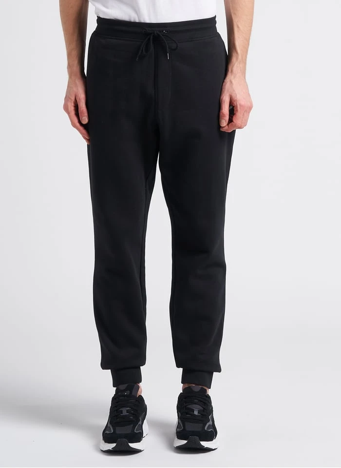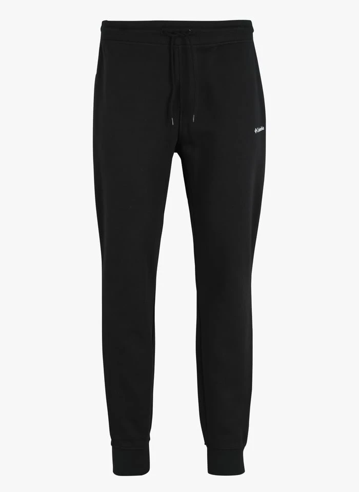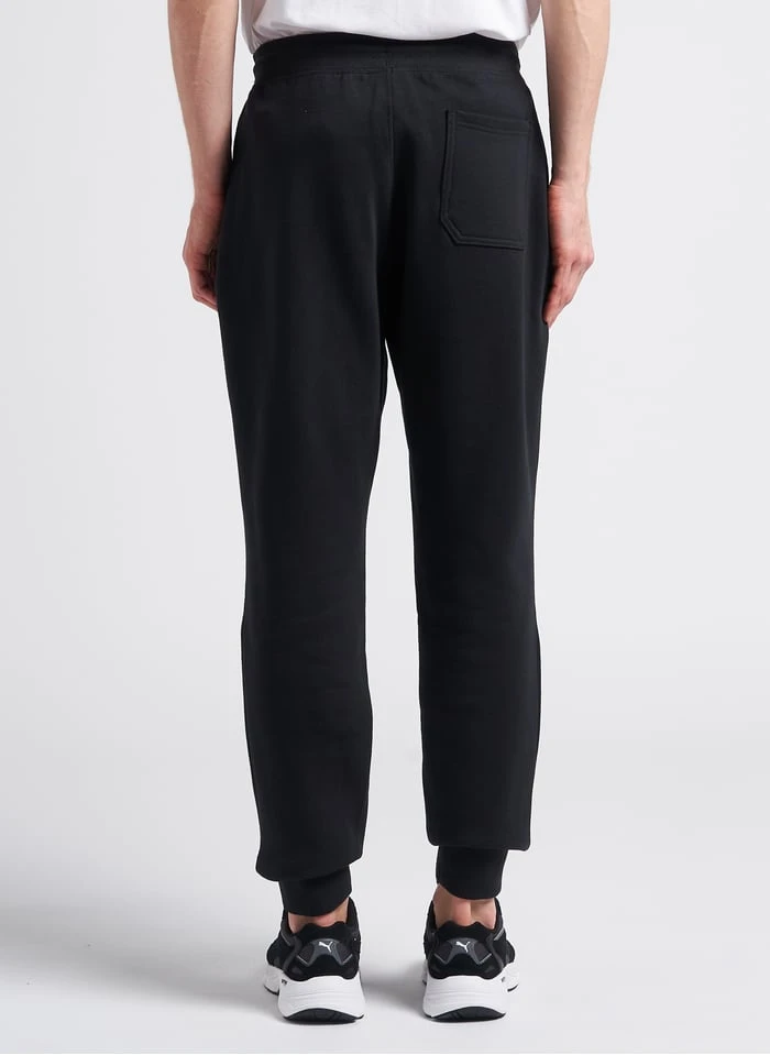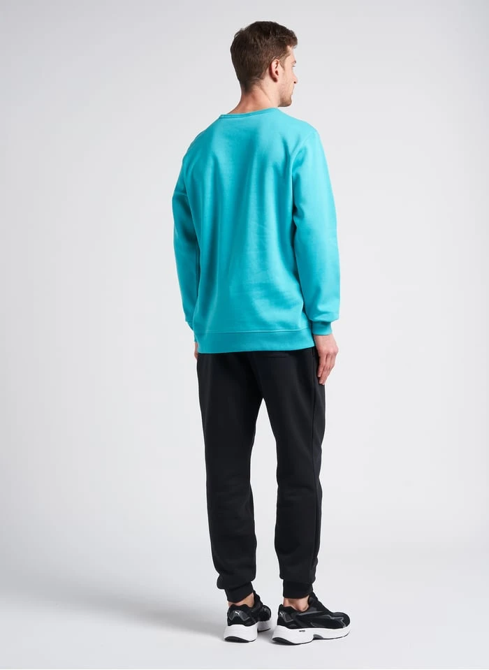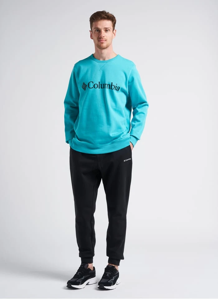 This model is shown wearing Regular-fit round-neck cotton-blend sweater with screen print by COLUMBIA, Low-top mixed leather sneakers by PUMA