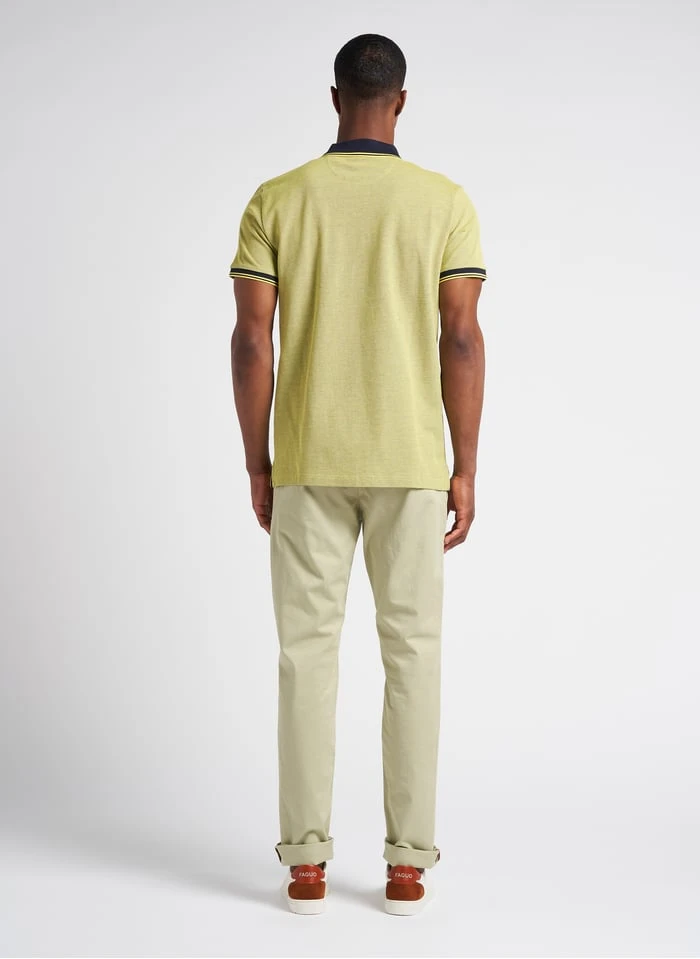 This model is shown wearing Slim-fit organic cotton chinos by CHEVIGNON, Leather low-top sneakers by FAGUO