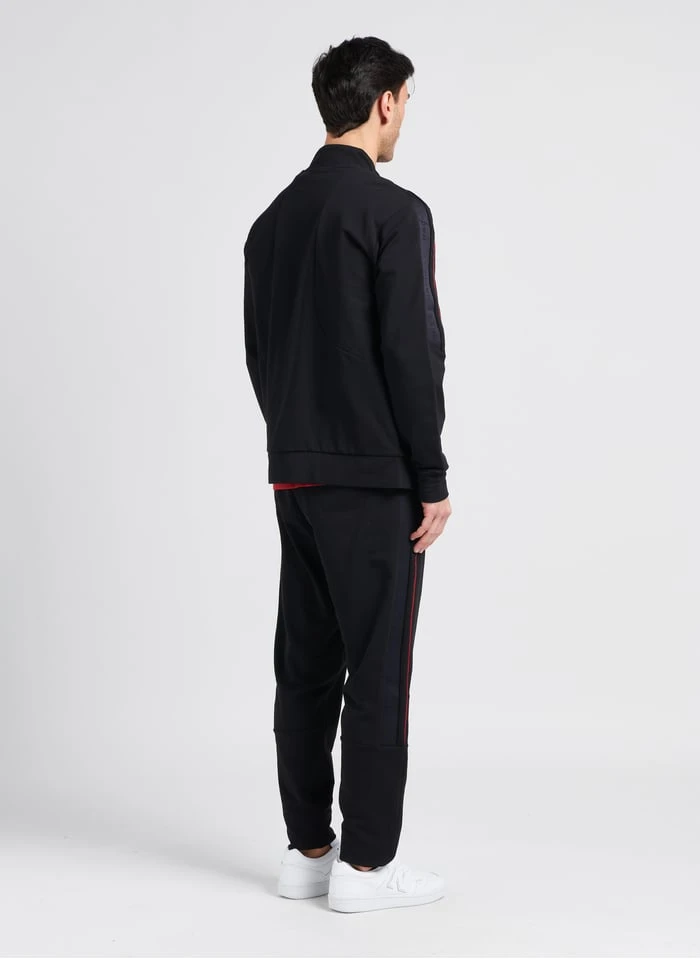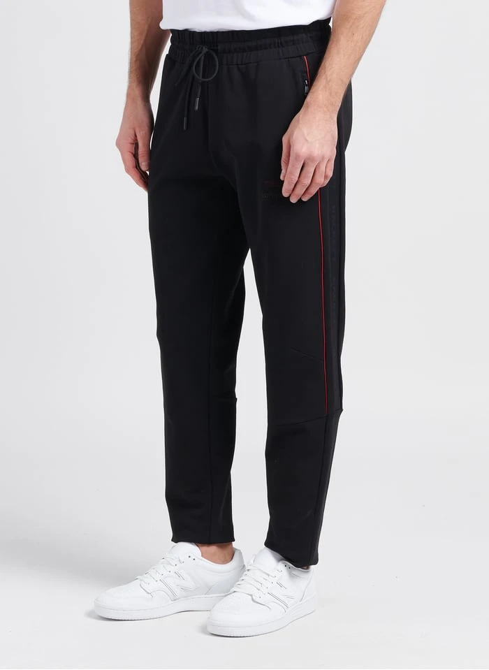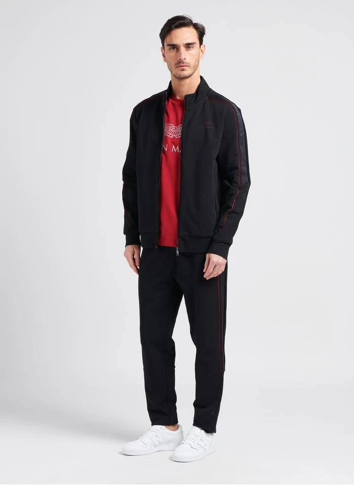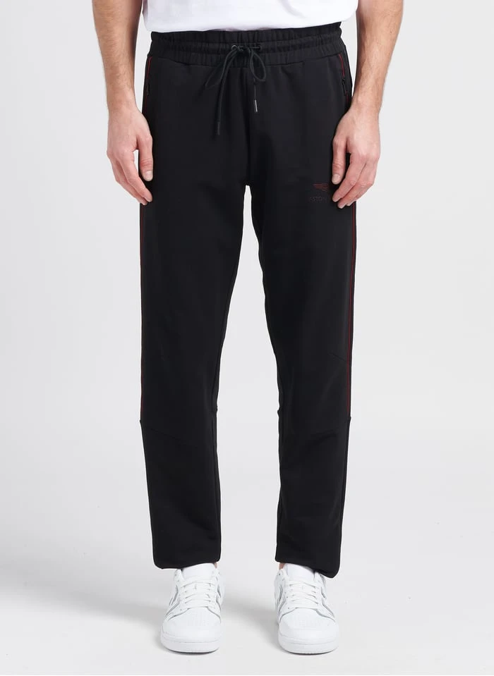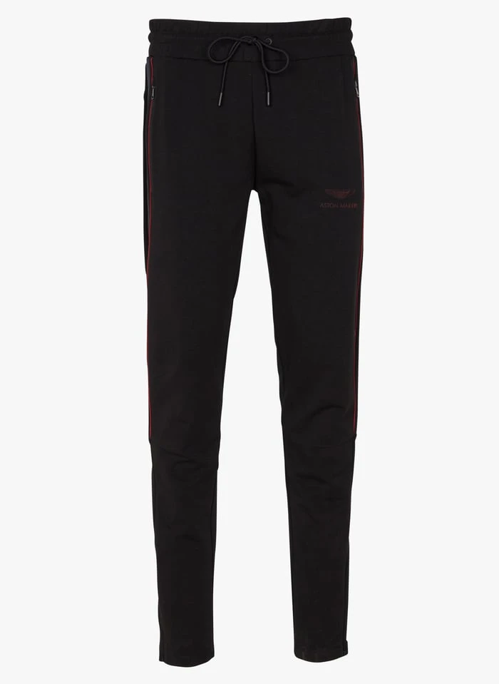 This model is shown wearing Hackett x Aston Martin regular-fit round-neck cotton T-shirt with screen print by HACKETT, Leather low-top sneakers by NEW BALANCE