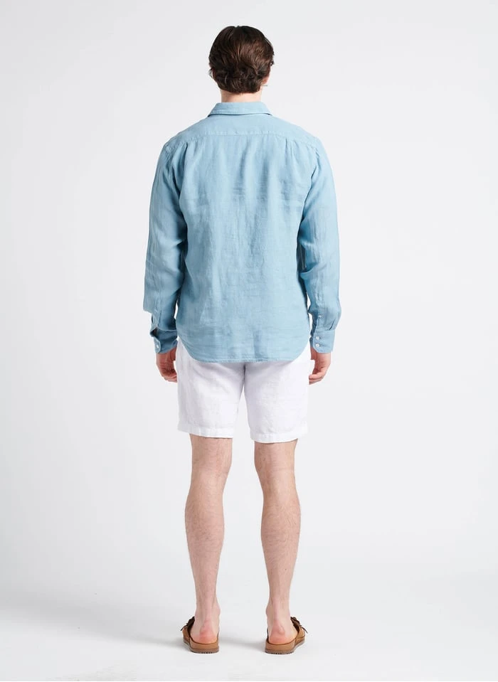 This model is shown wearing Linen Bermuda shorts by HARTFORD, Flat leather sandals by UGG