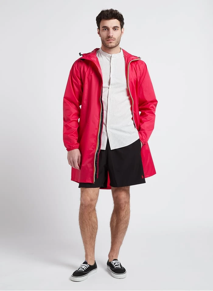 This model is shown wearing Plain swim shorts by POLO RALPH LAUREN, Long hooded waterproof windbreaker by K-WAY