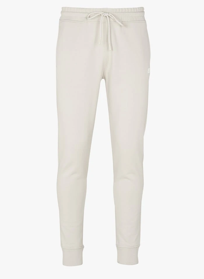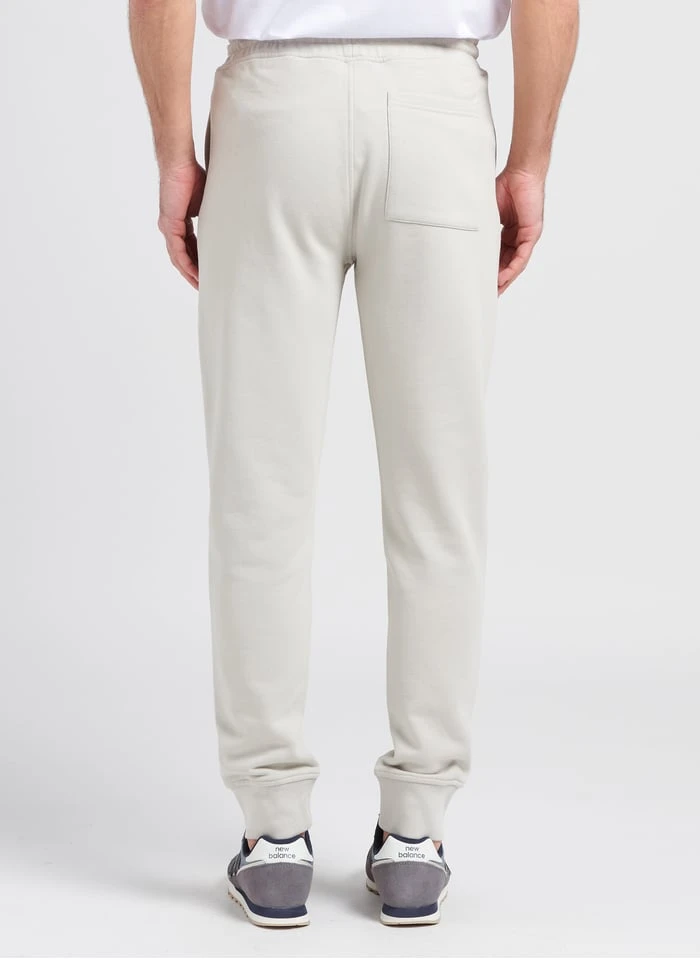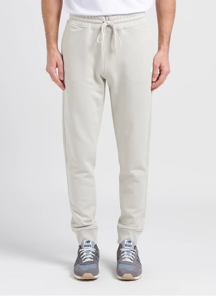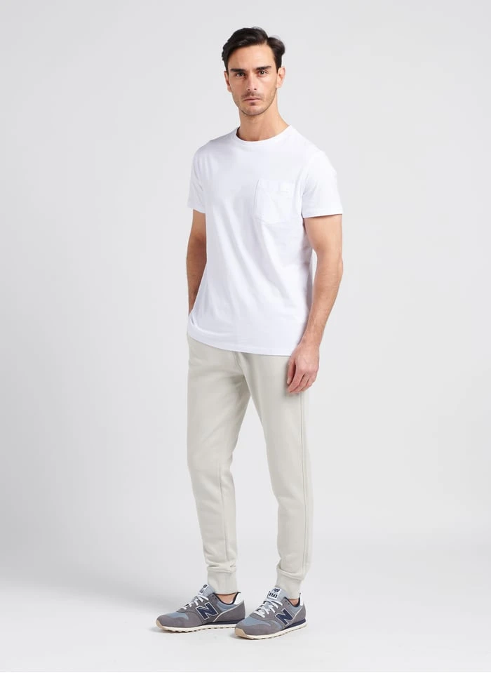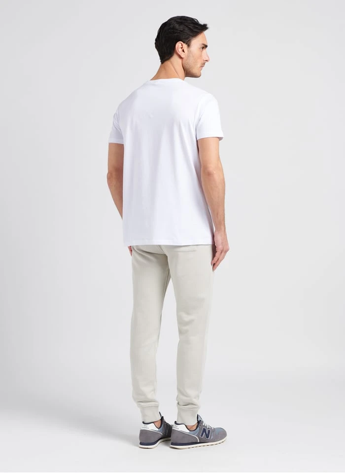 This model is shown wearing Round-neck cotton T-shirt by K-WAY, Low-top mixed leather sneakers by NEW BALANCE