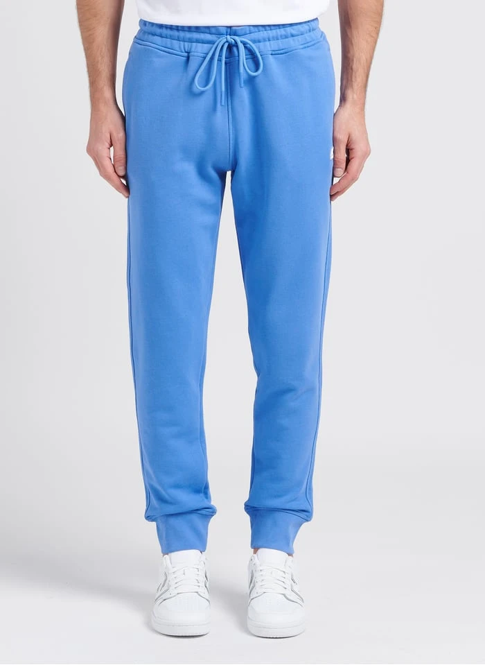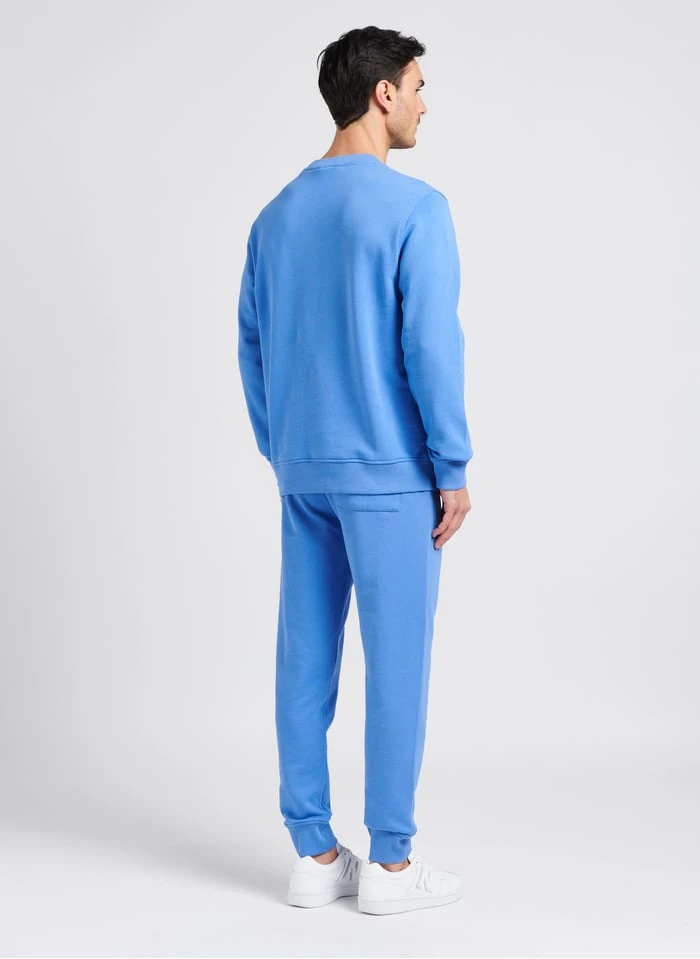 This model is shown wearing Round-neck cotton sweatshirt by K-WAY, Leather low-top sneakers by NEW BALANCE