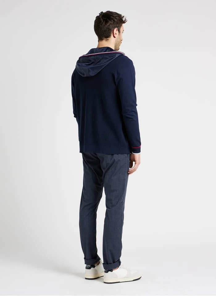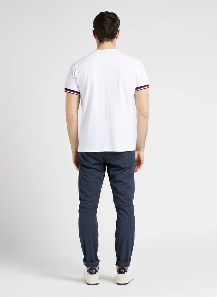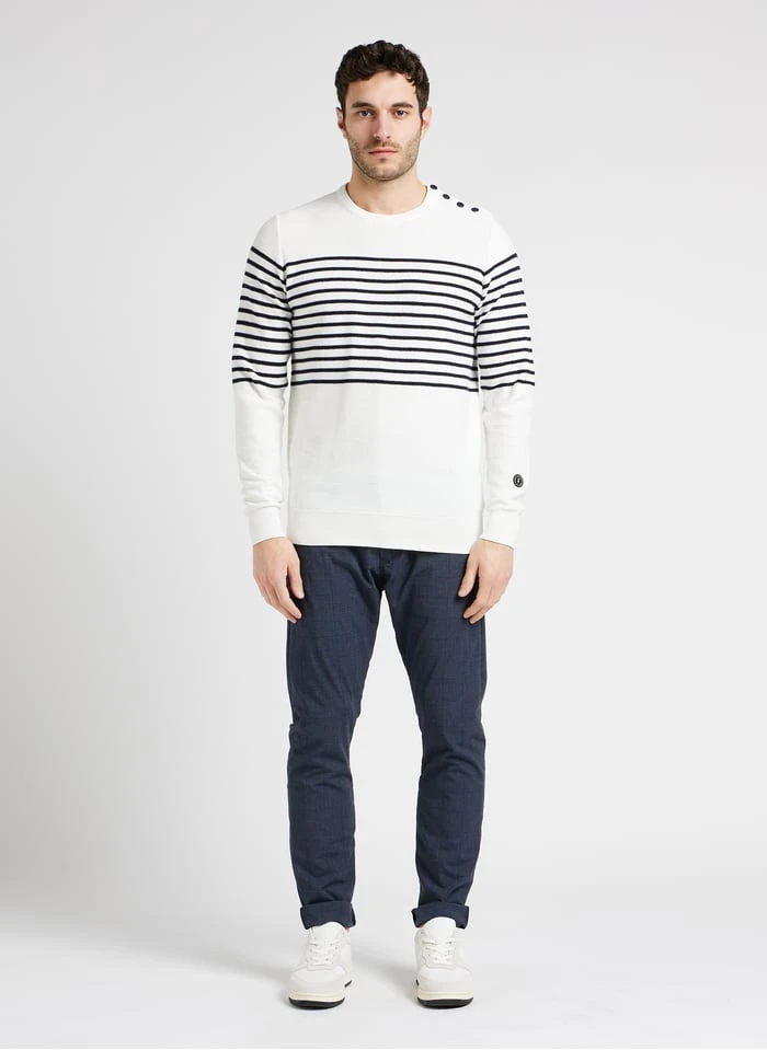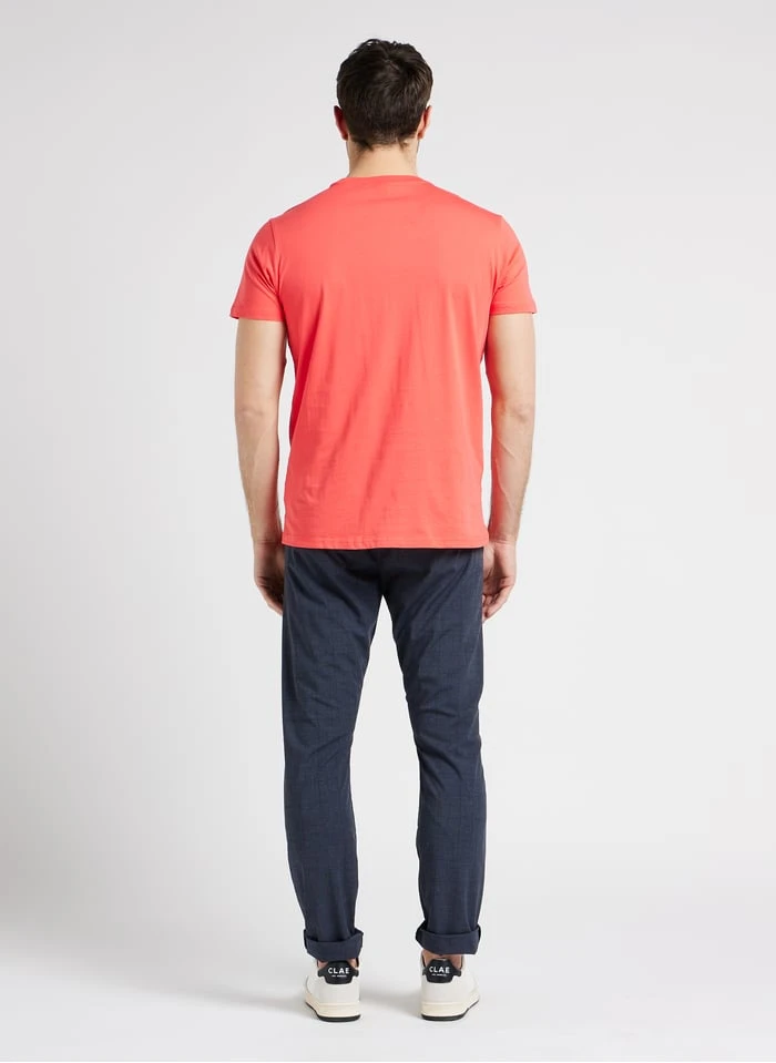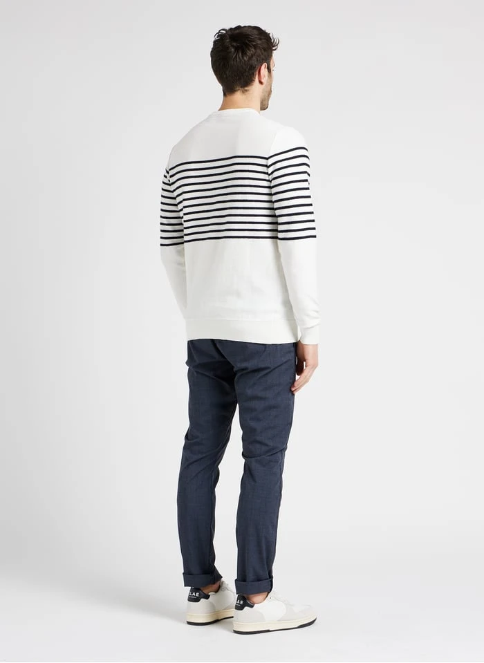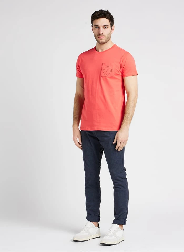 This model is shown wearing Round-neck cotton T-shirt by LE TEMPS DES CERISES