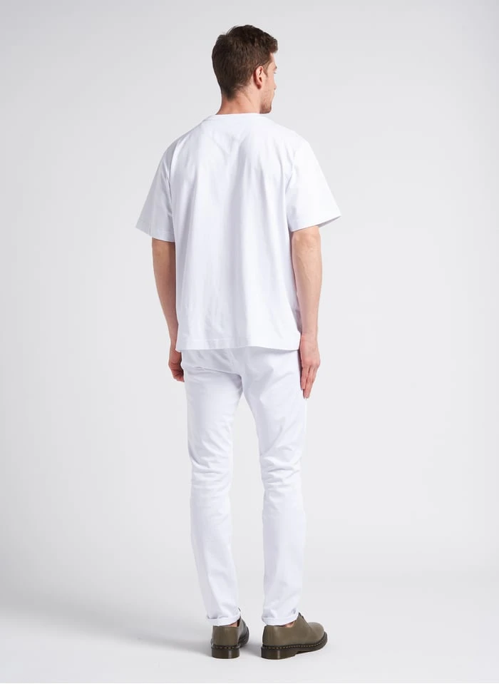 This model is shown wearing Round-neck embroidered cotton T-shirt by CHEVIGNON, Mixed leather Derby shoes by DR. MARTENS