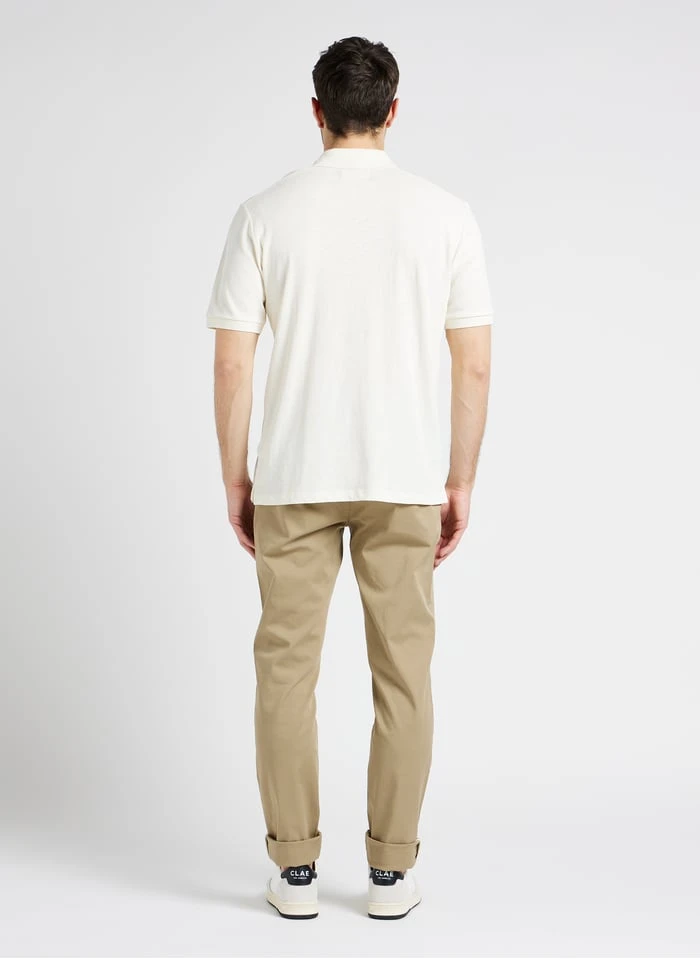 This model is shown wearing Straight-leg cotton-blend pants by LACOSTE, Leather low-top sneakers by CLAE