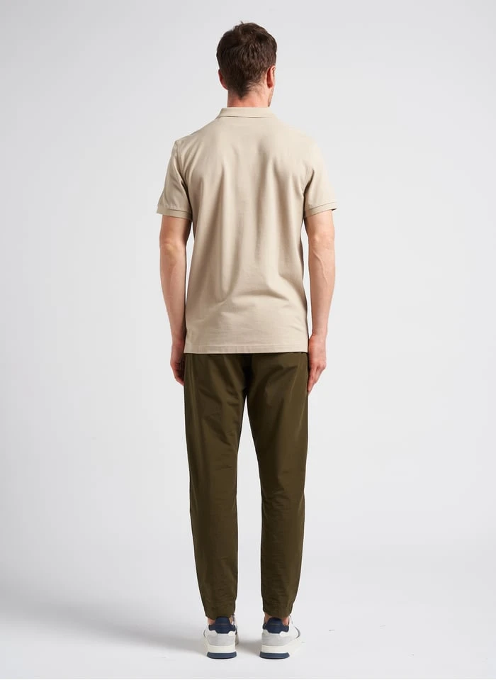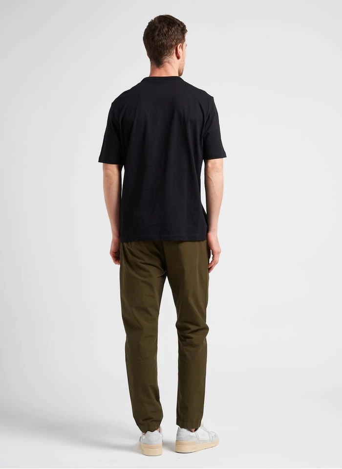 This model is shown wearing Regular-fit round-neck cotton T-shirt with screen print by LES DEUX, Low-top two-tone mixed-leather shoes by LACOSTE