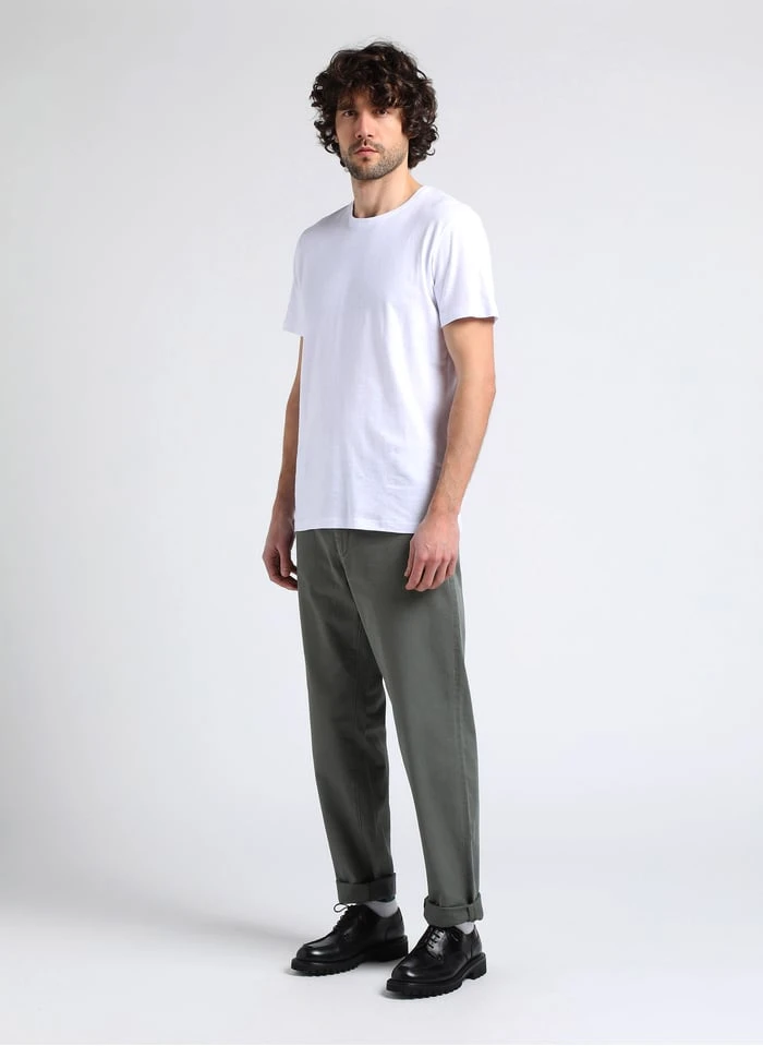 This model is shown wearing Round-neck cotton-blend T-shirt by SELECTED