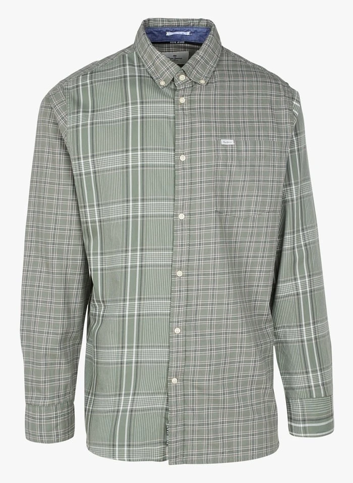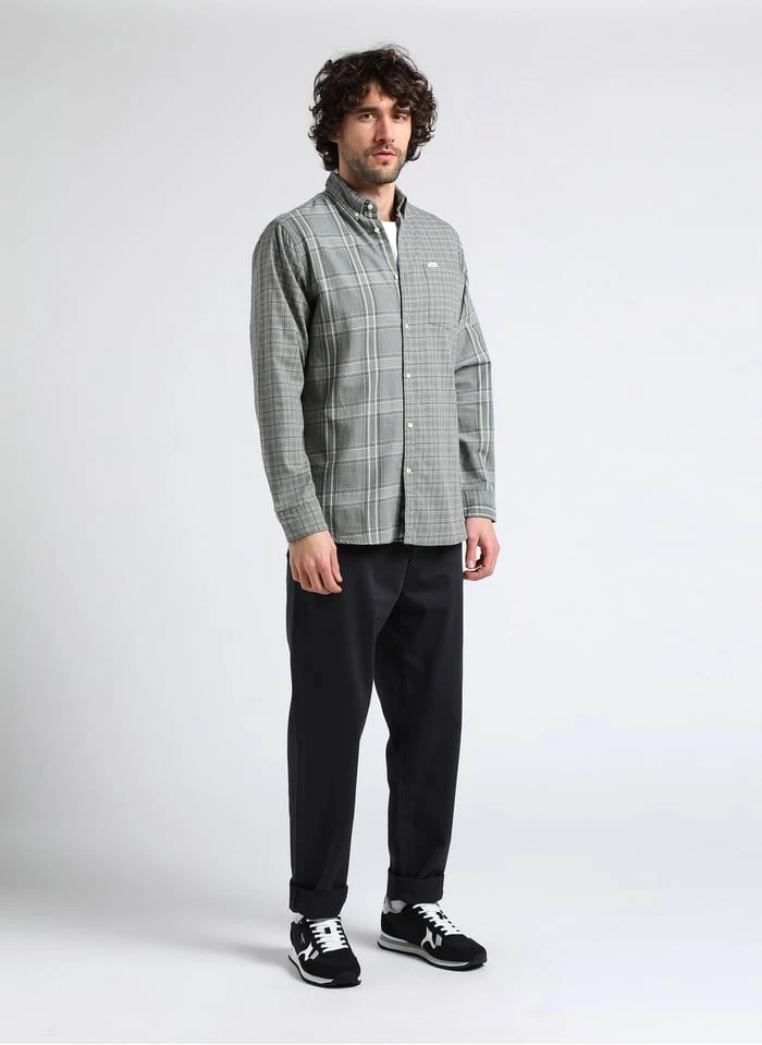 This model is shown wearing Straight-leg cotton-blend pants by PEPE JEANS, Low-top leather and mesh sneakers by PEPE JEANS, Leather document holder by BLEU DE CHAUFFE