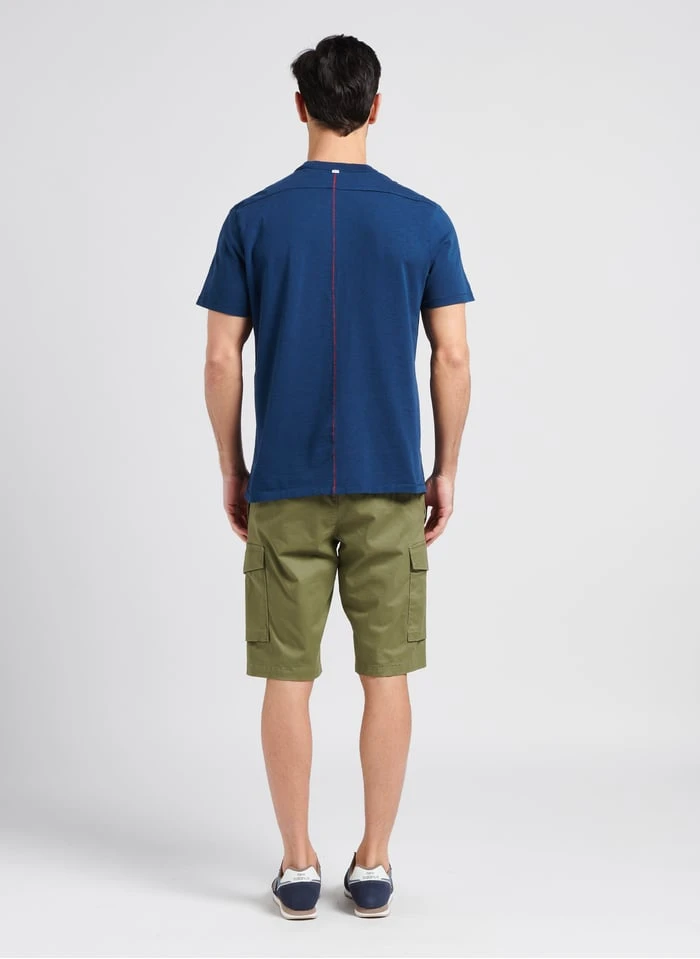 This model is shown wearing Cotton shorts with cargo pockets by TOMMY HILFIGER, Leather low-top sneakers by ADIDAS