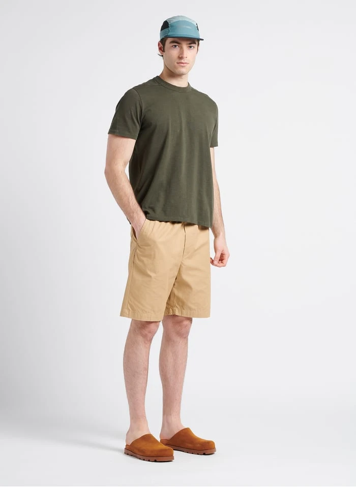 This model is shown wearing Straight cotton Bermuda shorts by SELECTED, Screen-printed cap by COLUMBIA, Flat leather mules by CAMPER