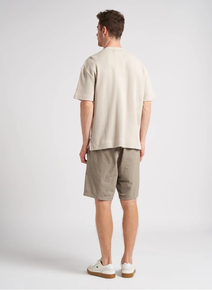 This model is shown wearing Organic cotton-blend textured Bermuda shorts by SELECTED, Leather low-top sneakers by LACOSTE