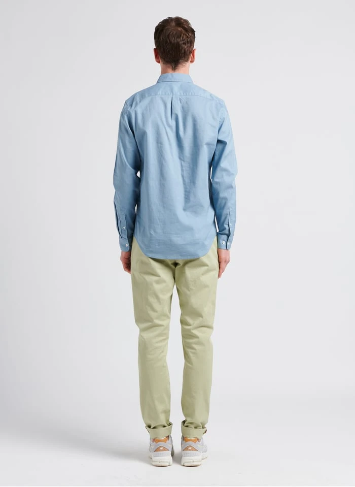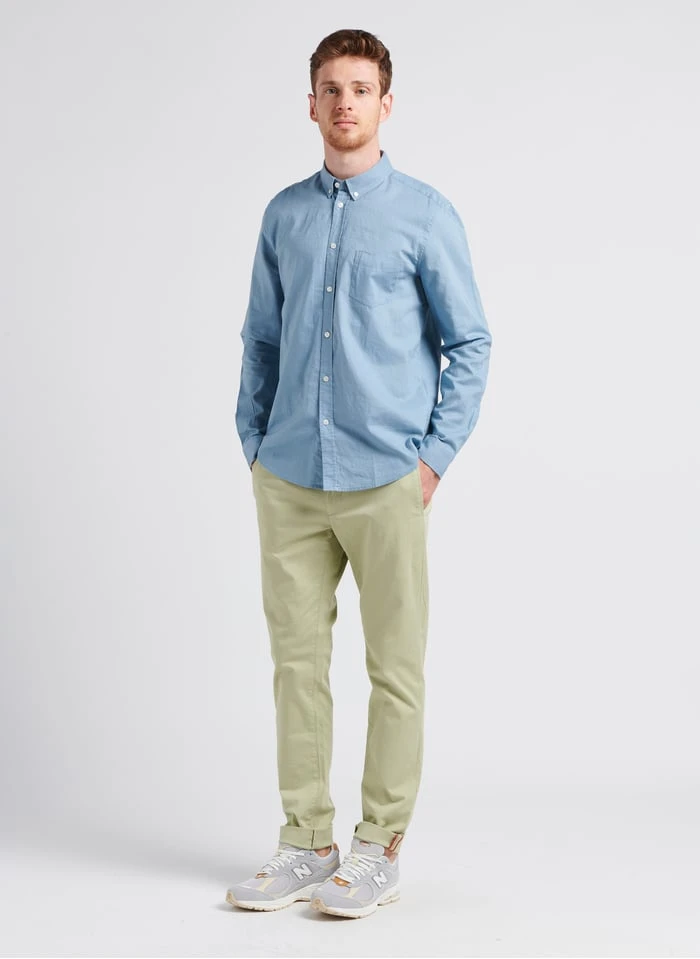 This model is shown wearing Slim-fit organic cotton chinos by CHEVIGNON, Low-top flatform sneakers by NEW BALANCE