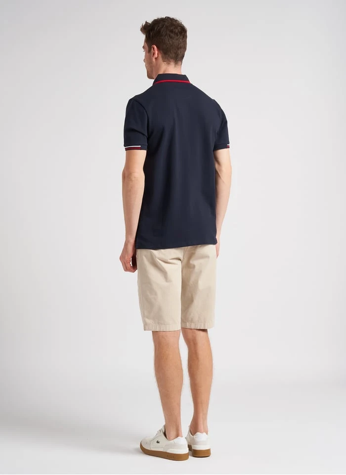 This model is shown wearing Regular-fit stretch cotton Bermuda shorts by SCHOTT, Leather low-top sneakers by LACOSTE